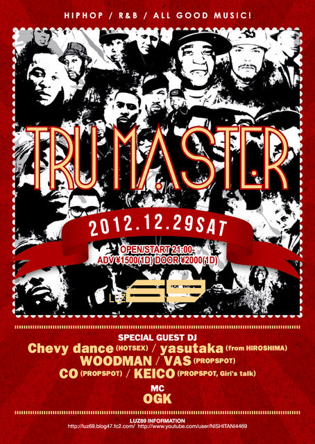 TRU MASTER 2012 [HIPHOP / R&B] ■2012.12.29 sat ■OPEN/START 21:00- ■@LUZ69 ■ADV \1500(1D) ■DOOR \2000(1D) ■SPECIAL GUEST DJ Chevy dance (HOTSEX) yasutaka (from HIROSHIMA)(STAY FLY) WOODMAN (STAY FLY) VAS (PROPSPOT)(STAY FLY) CO (PROPSPOT) KEICO (PROPSPOT)(Giri's talk) ■MC OGK (PROPSPOT) ☆毎年年末恒例のHIPHOP PARTY♪ LUZ69の仲間がみんな帰って来ます!! HIPHOP同窓会 & HIPHOP忘年会です(^^)