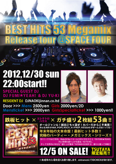 2012.12.30sun GLITTER-2012FINAL&MEGAHITS53RELEASETOURaomori@SPACEFOUR 22:00open!! RELEASEDJS DJFUMI★YEAH!&DJYU-KI RESIDENTDJ DJNAOKIjinnan.co.ltd swallowDJS shy-10,kurummy,Y-SOUL,TAICHI,shu,andmore GLITTERGIRLS kurummy,haru,misaki,konatsu ticket GIRLS 1000yen MENS 2000yen1D DOOR GIRLS 2000yen2D MENS 2500yen1D 女の子特典!! ご来場頂いた方に翌日同会場のカウントダウンパーティーの入場券をエントランスにてプレゼント!更にシンデレラカード登録で、次回以降のSPACEFOURのパーティーが