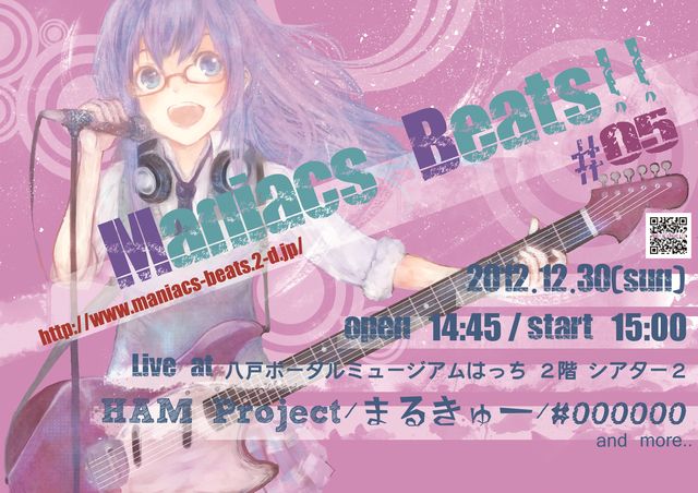 アマチュアのコピー・アレンジバンドによる、アニソン・ボカロ・ゲーソン・声優曲・ネットで話題になった曲だけを演奏するライブをやります! ================================================ Maniacs Beats!! #05 日付 : 2012年12月30日(日) 場所 : 八戸ポータルミュージアム はっち2階 シアター2 開場 : 14:45 開演 : 15:00 終演 : 19:00(予定) チケット:500円 出演 ・堀☆ランド(男性・女性Vo:アニソン中心) ・まるきゅー(GRANRODEOコピー) ・冬物語(女性Vo:アニソン中心) ・#000000(女性Vo:ボカ