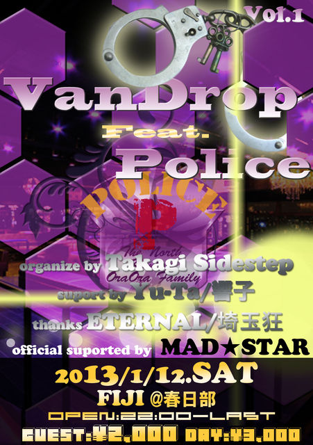 春日部FijiにてNewイベント”VanDrop”と”POLICE”がコラボします!! VanDropのオーガナイザーはSoulJapanにDJを始め、様々な分野でノリにのっている高木サイドステップ! さらに関東圏内を幅広く暴れまわる、今ノリに乗っている”POLICE”がでっかくコラボレーション! また、高木サイドステップが専属モデル、DJとして在籍する大人気オラオラブランド【MAD★STAR】のオフィシャルサポート! 当日は、【MAD★STAR】からスペシャルなゲストモデル参戦決定! また、POLICEからみゆ姉・隊長・そして初代洋虎こと洋一さんのバースデー入り