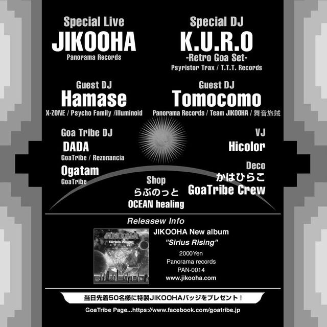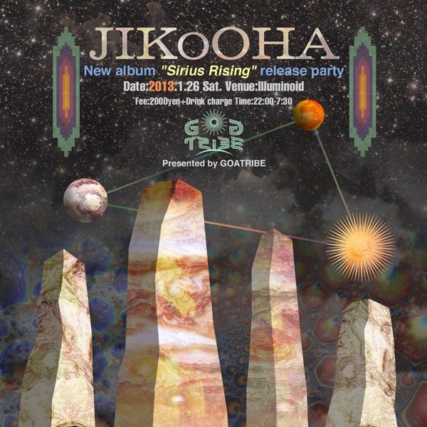2013年 新しい時代の幕開け。その貴重な時を祝うためGoaTribeがご用意したのは、JIKOOHA new album "Sirius Rising" release party !!! 新しい時代の到来とJIKOOHAのリリースを祝うため、HAMASE, K.U.R.O., Tomocomoとそうそうたる面子が駆けつけてくれました!皆さん共にこのすばらしい時を祝いましょう!!!