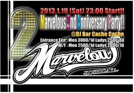 管理人様、告知失礼致します。 お手数ではありますが、不適切でしたら削除願います。 ★★★★★★★★★★★★★★★★★ 格安でご入場戴けるディスカウント希望の方は、 代表者の方のお名前と、ご来場人数の合計人数を添えてメッセージください。 ★★★★★★★★★★★★★★★★★ 2ヶ月に1度のお祭り騒ぎ! 奇数月第3土曜のCacheCacheは毎回満員御礼の鉄板パーティーMarvelous★ Marvelousもお陰様で早くも2周年! 沢山の方々に支えられて来た2年間。 本当にありがとうございました! 今までの感謝を詰め込