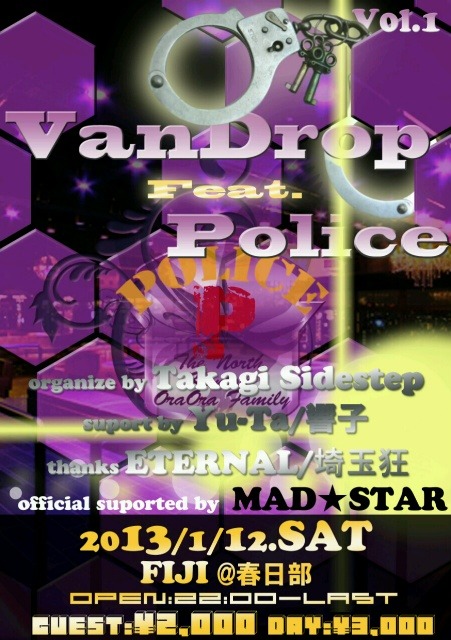 春日部FijiにてNewイベント”VanDrop”と”POLICE ”がコラボします!! VanDropのオーガナイザーはSoulJapanにDJを始め、 様々な分野でノリにのっている高木サイドステップ! さらに関東圏内を幅広く暴れまわる、今ノリに乗って いる”POLICE”がでっかくコラボレーション! また、高木サイドステップが専属モデル、DJとして在 籍する大人気オラオラブランド【MAD★STAR】のオ フィシャルサポート! 当日は、【MAD★STAR】からスペシャルなゲストモ デル参戦決定! また、POLICEからみゆ姉・隊長・そして初代洋虎こと 洋一さんのバー