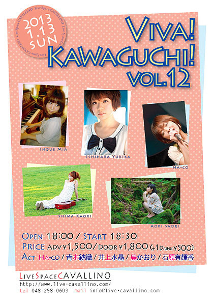 1/13(日) 川口CAVALLINO http://www.live-cavallino.com/ 『Viva!KAWGUCHI!vol.12』 開場…18:00 開演…18:30 出演…20:20(5組中4番目) 料金…\1500/\1800(前/当) (+1drink) サポート P:福島環 CHO:島よしみ 他出演者 18:30〜 Ha-coサン http://into-blackbox.seesaa.net/ http://twitter.com/hakojyo 19:10〜 青木紗織サン http://blog.livedoor.jp/mimosa_vo_pf/ http://twitter.com/sa_ma_ru 19:45〜 井上水晶サン http://ameblo.jp/inouemia http://twitter.com/MIA__crystal 21:00〜