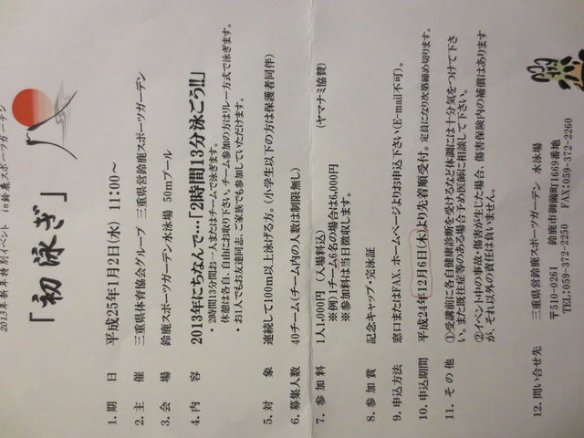 鈴鹿スポーツガーデンにて開催の「初泳ぎ」の参加者を募集します。 内容:1チームで2時間13分泳ぐ (個人でも可、1チームの人数制限なし) 参加費:1人1000円(入場料込) 参加賞:記念キャップ、完泳賞 申し込みには 氏名、ふりがな、性別、年齢が必要ですので 別途メッセージ等で送ってください。 参加される方は希望の時間を記入ください。 必要なら複数チームで申し込みます。 募集チーム数が40チームなので1コース4チーム程度で泳ぐことになると思います。 泳いだ後はどこかで食事しましょう♪ 追伸: