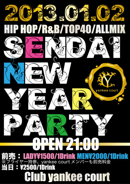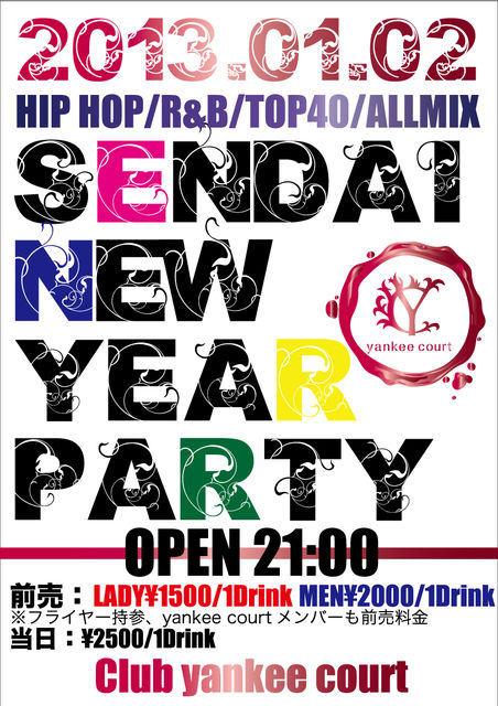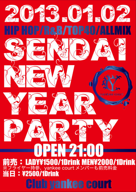 2013年一発目!!!!NEW YEAR PARTY!!!!! せっかくのお正月、寝て過ごすのはもったいない!! 人が動くこの時期!!!外に出ればきっと何かがある! 仙台のクラブでは唯一、yankee courtは元旦から営業しています!!! 昨年は200人を超えた2日の夜はBIG PARTY!!!! なんと、協賛にはあの仙台美少女図鑑!!!!! だから学生や日頃頑張っている社会人に加え 美容師、モデル、アパレル関係、スポーツ選手などなど 普段クラブに来ないようなメンズ、ガールズも! 年に一度のこの日はPARTYにきちゃうんです!!!!!! 最新HIPHOP、R&B、HOUSE、ALLMI