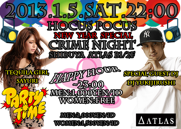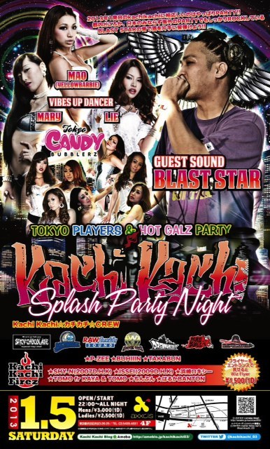 管理人さん告知させて頂きます。 TOKYO PLAYERZ & HOT GALZ PARTY 【KachiKachi☆☆☆カチカチ☆☆☆ 】 @渋谷club axxcis[4F] 東京都渋谷区渋谷3-26-25 / TEL : 03-5485-4011 OPEN/START 22:00〜LAST ADM:MEN:3000yen(1drink) WOMEN:2500yen(1drink) 2013.1.5(SAT) KachiKachi〜Splash Party Night〜 2013年1発目のkachikachiに相応しいのはやっぱりPARTY!! 新年を祝いながら新しい気持ちで良い一年のSTARTを、間違いない音とお酒で飲んで踊って皆で楽しもう!! 【GUEST SOUND】 BLAST STAR 【VIBES UP DANCER】 MAO(YellowBarbie) LIE Ma