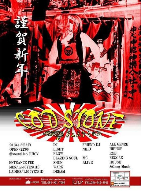 sound lab JUICY 新年一発目は "GOD STONE" 神石DJフェスティバル 2013.1.5(SAT) @sound lab JUICY OPEN/22:00 ENTRANCE FEE MEN/1500円(1D) LADIES/1000円(1D) DJ LIGHT/BLOW/BLAZING SOUL/SHUN/WARK/DREAM FRIEND DJ NIHO MC ALIVE ALL GENRE HIPHOP/R&B/REGGAE/HOUSE&good music 協賛店 日焼けサロン g-style http://g-style-tanning.com 084-921-7003 TATTOO STUDIO E.D.P http://www.fukuyama-edp.com 084-945-9041