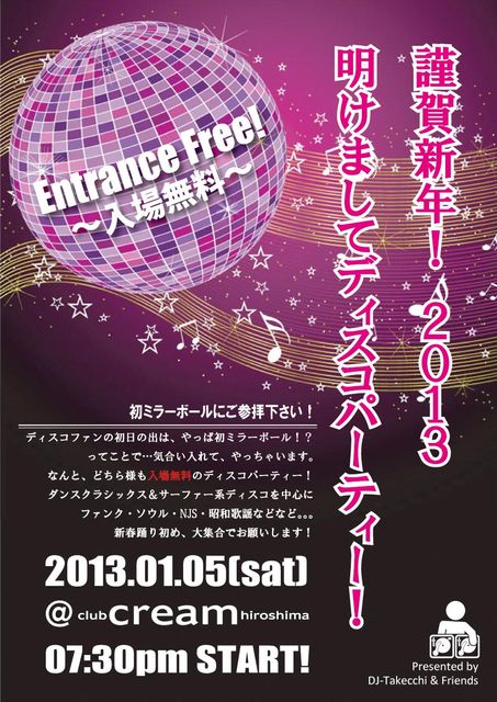たけちです!いつも、R45へのご来場ありがとうございます! さて、さて、2012年もいよいよ終わり。。。 今年一年感謝と、新春のお祝いってことで、1/5にイベント開催します! エントランスフリーなので、是非、是非、ご新規さんと一緒にお越し下さい。 新春バージョンで、なんか面白い事も考え中です。 I wish Merry Xmas & happy new year! たけっちでした! ************************************ 初ミラーボールにご参拝下さい! ディスコファンの初日の出は、やっぱ初ミラーボール