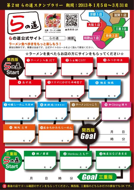以前告知していましたように年明けから行われる「らの道2013」に挑戦します。 内容は1/5〜3/31の間で参加12店舗を巡るスタンプラリーです。 今回は初日という事でスタートダッシュで和歌山まで遠征したいと思います。 http://ranomichi.blogspot.jp/2012/11/blog-post_2.html 集合場所:阪急摂津駅(集合して車で行きます) 時間:午前9:00 定員:8名 参加者のお腹と相談しながら何軒かまわりたいと思いますので、空腹にしといて下さい 追記:交通費については実費清算致します☆