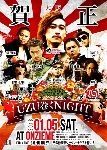 『UZU巻くNIGHT 〜とぐろ巻〜』@ONZIEME(オンジェム) 【OPEN / CLOSE】 16:00 / 22:00 【CAST】 卍LINE /BOXER KID/ BIG BEAR / GAZZILA / TAKE-T /HISATOMI/RAM HEAD/寿君 【SOUND】 MIGHTY JAM ROCK / OGA from JAH WORKS 【 DJ 】 ハンマーナオ / AKIO BEATS / B=BALL 【EARLY TIME】 3M / JUZZY その他、豪華シークレットゲスト出演有り!? and more... UZU巻くNIGHT CMもYouTubeにて公開中!! http://www.youtube.com/watch?v=p0icKZCFYn4 ここにもま