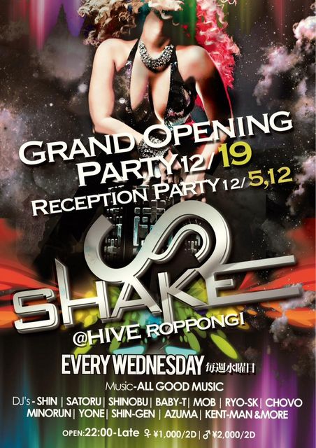 管理人様書き込み失礼します。 1/9(WED)[SHAKE]@六本木HIVE ----------■□■□■□■□■□■□■□■---------- ★ゲストでの入場方法はコチラ★ エントランスにて 『シノブのゲストでシェイク』 と、伝えて頂ければ [ゲスト料金] 男性1000円 1Drink 女性1000円 4Drinks にてご入場頂けます。 ----------■□■□■□■□■□■□■□■ ---------- SHAKE 2012/1/9(WED) OPEN 22:00〜 MEN¥2000(2drink),WOMEN¥1000(2drink) DJ : SHIN,SHINOBU & more 六本木の綺麗でオシャレなLounge...「六本木L