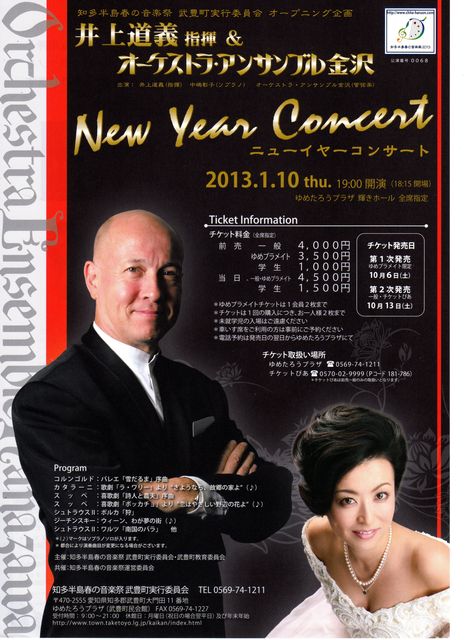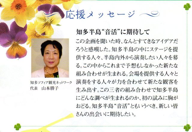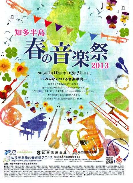 あけまして おめでとうございます! 初めての、知多半島春の音楽祭が 1月10日(木)から開催されます。 まだ寒さを感じますが、 この音楽祭が春の暖かさを運んでくれるでしょう! 出演者のみなさま お客様のみなさま そして、お迎えする会場のみなさま 〜 みんなでつくる音楽半島 〜 知多半島の春風は早くやってきます。 海がきらきらと輝き野辺には花々が咲きみだれます。 美し音楽・楽しい音楽があればどんなに素晴らしいことでしょう。 春の到来を音楽とともに楽しみながら、 みなさまといっしょに音楽祭を創り上げましょう