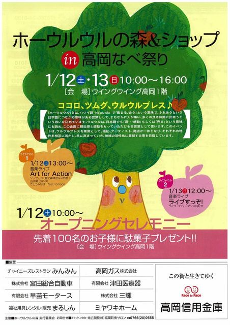 2013年1月12〜13日、高岡駅周辺で開催される『日本海高岡なべ祭り』において福祉とアートそして商店街のつながり『ホーウルウルの森&ショップin高岡なべ祭り』が開催されます♪ 当日、ウィングウィング会場ではさまざまなアート体験や雑貨、小物の販売、福祉関連の作品や食品販売などが実施されます。 また、まちなか会場では市内の福祉作業所で製作したイベントアイテム『ウルウルブレス』をご購入の方に、素敵な特典やサービスを受けてもらうことができます。 また、両日ともウィングウィング会場では素敵なアーティストによ