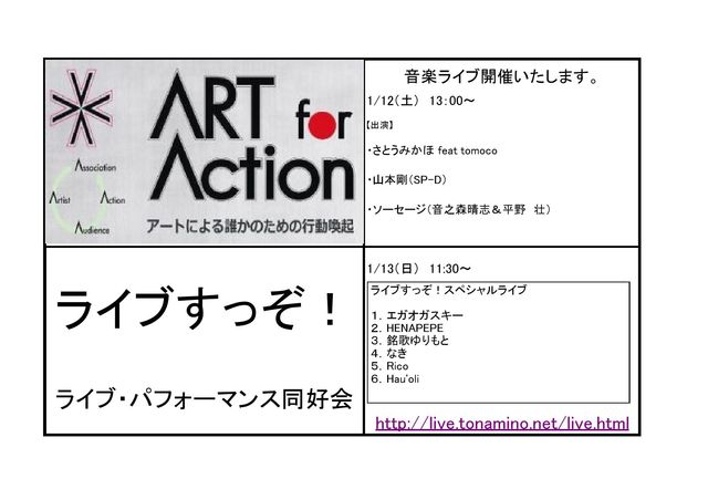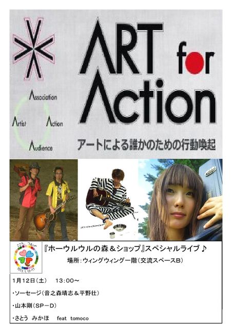 ■1月12日(土) ART for ACTION ホーウルウルの森&ショップin 高岡なべ祭り 場所:高岡ウイングウイング高岡1階(交流スペースB) 出演:ソーセイジ、さとうみかほ、山本剛 開演:13:00〜 山本剛ライブ 13:30〜 新年初ライブは、山本たけしのソロライブです! ぜひ、なべ祭りとともに、イベントライブもご堪能くださいね〜♪