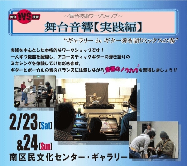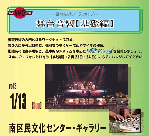 何度か告知していますが、今年度最後の南区民文化センター主催音響講座です。 既に機材を持っている大学では勿論、持ちたいと希望している大学の方は、 必ず参加して勉強するようにお願いします。 そうじゃないかたでも路アカとか機材手伝いしたかったら是非。 なお、大学単位で何人も受講したい場合など、基礎編の内容まででしたら、 ゴスカル個人でも開講出来ますので、別途ご相談下さい。 ☆舞台技術ワークショップ〜舞台音響【基礎編】☆ 南区民文化センターでは、実践的な舞台技術を学習することのできる事業として、舞台技術ワ