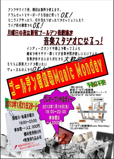 来年1月から始動します「ゴールデン街劇場 Music Monday」のプレオープンが正式に決まりました。 日時は、2013年1月16日(18:00〜22:00) 参加料は、2000円 場所は、新宿ゴールデン街劇場 http://golden-gai-gekijou.jimdo.com/ アクセス等はホームページを御覧下さい。。 グランドオープンは1月21日月曜日からですが、開催日は決まり次第随時告知していきますので宜しくお願い致します。。 何れは、、毎週月曜日の開催を目指したいと思います。。 みなさんで楽器を弾き...また歌い...セッショ