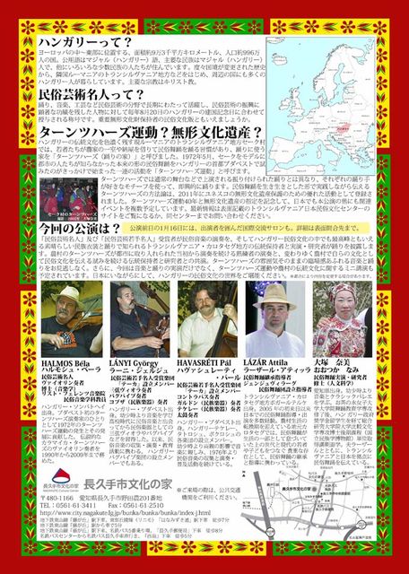 ハンガリーのブダペストで、農村の民俗舞踊を実践する新たな場「ターンツハーズ」が 初めて試みられてから今年で40年。民俗舞踊を生きた形で伝えるターンツハーズの 方法論は昨年ユネスコの無形文化遺産保護のための優れた活動としても登録されました。 これを記念して、日本で本場の音楽と踊りを体感できるイベントを開催します。 「民俗芸術名人」および「民俗芸術若手名人」受賞者が民俗音楽の演奏を、 そしてハンガリー民俗文化の中でも最高峰といえる素晴らしい民族衣装と踊りで 知られるトランシルヴァニア・カロタセグ地方の伝統保持者