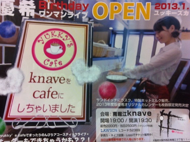 みなさまー 2013年あけましておめでとうございますー♪ 今年も楽しく♪でもしっかりと! 私らしい歌をお届けしていけたらいいなぁと思っていますので どうぞよろしくお願いします☆彡 ところで! あともう16日後! 1月18日(金)に去年より広い私史上一番大きなところでのバースデイワンマンライブが迫ってきております! 新年早々まったりのんびーり楽しんでいただけるように、色々といっぱい企んでおりますので、ぜひぜひ遊びに来て頂きたいです(*゚▽゚*) ★2013年1月18日(金)南堀江knave 優希Birthdayワンマ
