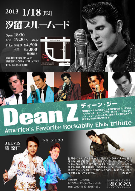 アメリカで最も活躍しているエルビス トリビュート アーチスト Dean Z が2013年1月17日に来日します。ライブVOL1は18日に汐留ブルームードで開催されます。
