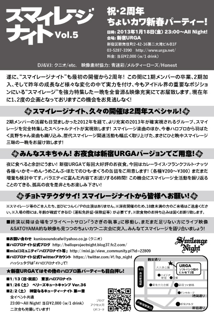 お世話になっております。 遂に、 “スマイレージナイト”も1st開催から2周年! http://mixi.jp/view_event.pl?id=59095824 この間に1stメンバーの卒業、2期加入、昨年の成長など、 様々な変化の中、実力を付け今もアイドル界の重要なポジションにいる、 スマイレージを協力特集した一晩を全音源&映像充実にてお届致します。 現在、年に1、2度の企画となっておりますこの機会をお見逃しなく! “スマイレージナイト Vol.5” 〜祝・2周年・ちょいカワ新春パーティー!〜 日時:2013年1月18日(金)23:00〜All Night! 会場