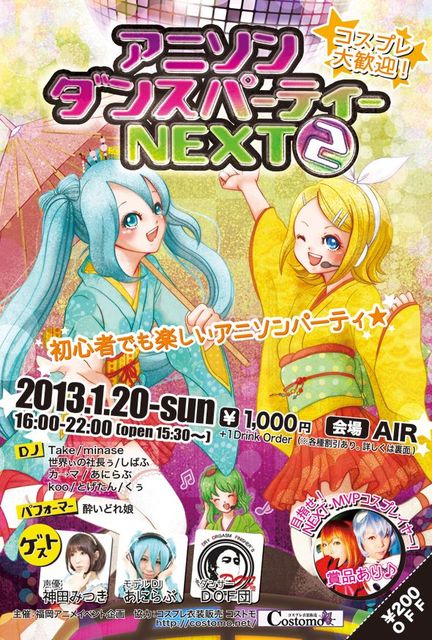 ■アニソン・ダンスパーティー・NEXT 2 200名を動員した、あの「アニソン・ダンスパーティーNEXT」が帰ってきた! ステージ×コスプレ×パフォーマーをキーワードに、 DJやゲストがみんなを盛り上げます。 ・イベント初参加者無料! ・コスプレ衣装無料レンタルあり! ・MVPコスプレイヤーには次回無料券&賞品プレゼント! ■場所・料金 日時:2013年1月20日(日) 会場:会場 AIR(親富孝ローソン3F) 時間:16:00〜22:00(open15:30) 料金:1000円+1ドリンク(500円) ■割引 クラブイベ