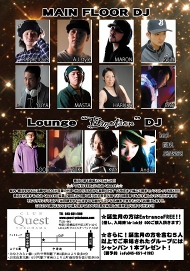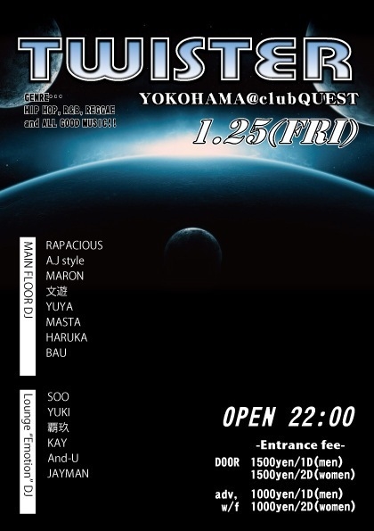 管理人様、告知失礼します! 横浜の第4金曜といえばこれ ☆☆『TWISTER』@club Quest☆☆ 都内・横浜を中心に各方面で活躍中のDJが定番のHIP-HOP/R&Bから最新のHIT TUNEまで幅広く朝までノンストップMIX!!!! 横浜を代表するclub Questの最高の音質とDJ陣の繰り出す良質な音でどの時間帯でも必ず楽しんでいただけます そしてラウンジフロアでは旧譜を中心に往年の名曲からコアな名曲まで余すとこなくお届けします この2つの異なるフロアが織り
