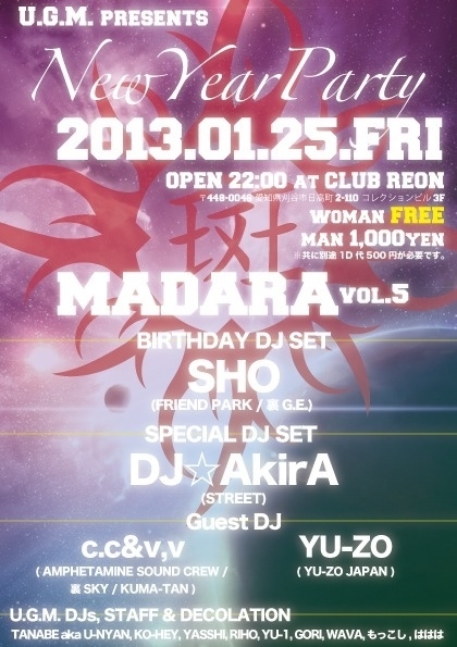 【U.G.M.presents ...】 ☆MADARA...斑...MADARA☆ ☆2013/1/25fri☆ ☆PsychedelicTrance.Tech.Party~2013new year party☆ 毎回勢いを増す三河発サイケデリックトランスPARTY!斑の新年一発目のパーティーです!! 2013年もU.G.M.を是非よろしくお願いします! CLUBはもちろん刈谷のREON! 最高の音と空間であなたを異次元に運びます。 今回の斑のスペシャルゲストには遂にやってきました! 名古屋の名門CLUB STREETが生んだ天才! DJ☆AkirAをスペシャルゲストでやってきます! 今や芸能活動でも活