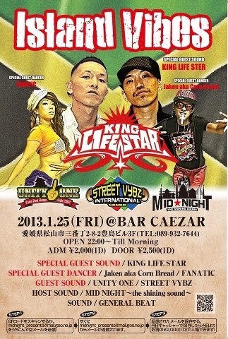 【ISLAND VIBES】 2013/1/25(FRI) @BAR CAEZAR 愛媛県松山市三番町2-8-2 豊島ビル3F OPEN/22:00-TILL MORNING ADM/\2000(1D) DOOR/\2500(1D) E-MAIL TICKET midnight_presents@mail.goo.ne.jp E-MAIL TICKETはmail.goo.ne.jpをドメイン指定解除してから〜に空メールをおくってください。 すぐにこのメールから返信がありますのでそのメールを当日キャッシャーに見せてください。 ※こちらのメールはお一人様1通必要です。 【SPECIAL GUEST SOUND】 KING LIFE STAR 【SPECIAL GUEST DANCER】 JAKEN aka CORN BREAD/FANATI