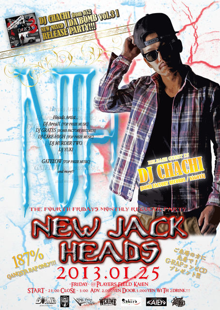 みなさんあけましておめでとうございます!! 2012年はN.J.H発足と共に毎回足をお運びいただいてありがとうございました!! 2013年も勢いにさらに勢いをつけN.J.H猛進して行こうと思いますので是非ともご愛好賜りますようお願いします!! さて2013年のN.J.H FIRST IMPRESSIONはDJ CHACHI DA BOMB vol.3リリースパーティー!! 昨年2012年に、6年間の歴史に幕を閉じたF.K.Iモンスターパーティー「MURDA SUCKER」でもお馴染み、G-RAP DJといえば… ハイクオリティーな知識、選曲、スキルという要素を持つDJをCHACHIのMIX SHOWをとくとご堪能あれ!!