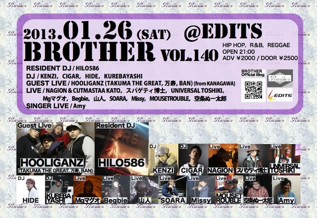 管理人様、コミュニティー参加者の皆様、イベント告知&出演者募集 失礼します!! 【1/26(土) BROTHER vol.140 at EDITS】Guest/ HOOLIGANZ (TAKUMA THE GREAT、万寿、BAN)