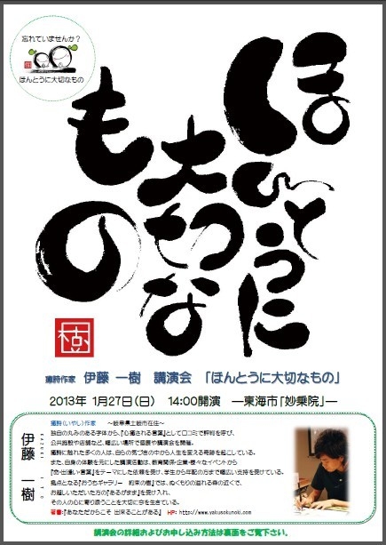 皆様あけましておめでとうございます 「妙乗院」にて、癒詩作家伊藤一樹さんをお迎えして講演会を開催させて頂く事になりました 進化がとまらず、遠方からもたくさんの方が訪れる妙乗院での、 心があたたかく、す〜っと軽くなるお話・・・ 忙しい中で忘れがちな「ほんとうに大切なもの」この機会に思い出してみませんか? 癒詩作家 伊藤一樹 講演会 「ほんとうに大切なもの」 【日時】 2013年1月27日(日) 開場 13:30 開演 14:00 終演 15:30予定 【会場】 四季桜の寺