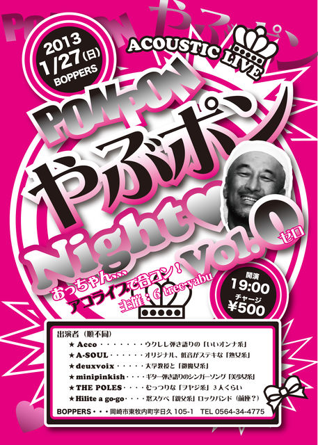 ACOUSTIC LIVE PON PON やぶポン Night Vol.0 2013 1月27日 日曜日 19:00 スタート チャージ ¥500 出演者 ☆ Acco ウクレレ弾き語りのいいオンナ系 ☆ A-SOUL オリジナル、低音がステキな熟女系 ☆ deuxvoix 大学教授と微魔女系 ☆ minipinkish ギター弾き語りのシンガーソング美少女系 ☆ THE POLES むっつりなヲヤジ3人くらい ☆ Hilite a go-go 怒スケベ親父系ロックバンド(前座?)
