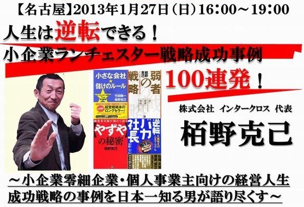 皆さんこんばんは。 名古屋の日報コンサルタントの麻井克幸と申します。 来る1月27日(日)に栢野克己さんをゲスト講師にお招きしてセミナーをやります。 小企業・零細企業・個人の経営者の方必見の内容です! お近くの方がいましたら、ぜひ宜しくお願いします! 詳しくはこちら↓↓↓ http://www.yell-consulting.com/seminar/rebirth/127.html