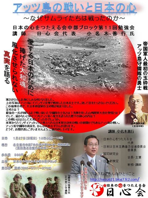 こんばんは。 日本の心を伝える会中部ブロックです。 今回の中部ブロック勉強会は、日心会オーナーねずさんの講演を予定しております。 新年を迎え、心も新たに「日本の心」に触れてみませんか? 日本人の真実の姿を知り、ご家族やご友人と語り合い共有する幸せな時間となるに違いありません。 どうぞ、お気軽にお越し下さいませ。 日 時 平成25年1月27日(日曜日)13時30分〜16時 場 所 名古屋市中区「中生涯学習センター視聴覚室」 (愛知県名古屋市中区橘1−7−11) 講 師 小名木善行(国史研究家、