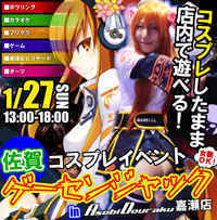管理人様、貴重なスペース失礼します。 コスプレしたままゲーセンで自由に遊んで、撮って、楽しみませんか?^^* 2013年1月27日 佐賀コスプレイベント 「ゲーセンジャック」 @遊道楽嘉瀬店 13:00〜18:00 ・店内移動自由 ・ボウリング・カラオケ・ダーツ・プリクラその他ゲームコスプレしたままプレイ可能。 ・参加費無料 ※プレイ代は別途必要 ・更衣室有り(利用時間13:00〜18:00) ※男性更衣室・女性更衣室用意しております ・荷物置き場有り ※監視カメラで盗難の心配ナシ! ・オールジャ