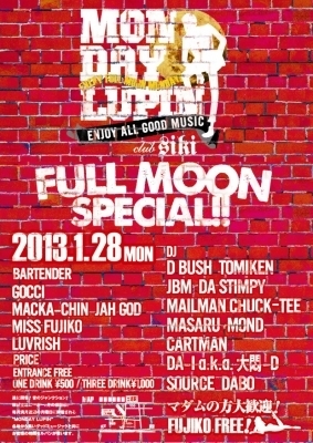 第20回☆ 2013.01.28 MON ☆ ◯ MONDAY LUPIN ◯ ENJOY ALL GOOD MUSIC FULL MOON SPECIAL!! DJz D-BUSH TOMIKEN JBM DA STIMPY MAILMAN CHUCK-TEE MASARU MOND CARTMAAN DAIaka大悶D SOURCE DABO BARTENDER MACKA-CHIN JAH GOD GOCCI MISS FUJIKO LUVRISH FOOD 真夜中のフルーツカット お肉屋さんのベーコン 富田屋 豚の角煮 汽笛カフェ などなど.... FUJIKO FREE !!!!!! マダムサービス有り PRICE ENTRANCE ONE DRINK 500 TAREE DRINK 1000(初回) @clubSIKI (茨城県土浦市川口1-11-5 (3F) ) 遂