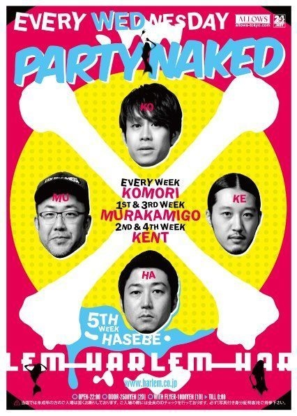 管理人様、告知失礼致します。 渋谷HARLEM、毎週水曜開催のレギュラーパーティー『Party Naked』!!! 楽しい事間違いなし!!!! 選曲も“ALL PARTY MUSIC”をコンセプトに、ジャンルの壁を飛び越えたひたすら楽しめる選曲で水曜の夜を揺らします! 出演は、言わずと知れた東京代表 DJ KOMORI! 黎明期よりシーンを支え続けるパーティーロッカー DJ HASEBE! 全国各地から実力派DJ陣が集結します!! ★☆★☆★☆★☆★☆★☆★☆★☆★☆★☆★☆★☆★☆★☆★☆★☆★☆★☆★☆★☆★☆ また、メッセージのやり