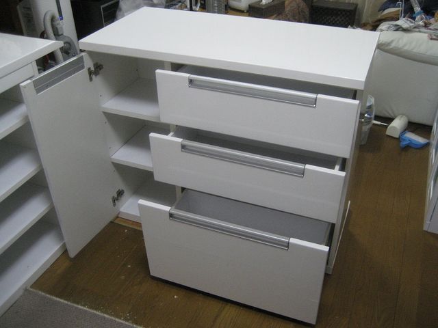 使用しなくなったバーカウンターセットを売ります。 バーカウンター1 (定価56,000円) size 巾:120? 奥行:50? 高さ:84? 色:鏡面ホワイト 4段の収納 アルミクロームメッキ足置き付 バーカウンター2 (定価52,500円) size 巾:99? 奥行:50? 高さ:84? 色:鏡面ホワイト 引出収納タイプ アルミクロームメッキ足置き付 カウンターチェア ×2 (定価6,990円 ×2) size 巾:43? 奥行:44? 高さ:58〜70?くらい 色:白 360度回転式 昇降式 ハイスツール ×1 (定価 不明) size 高さ70?く