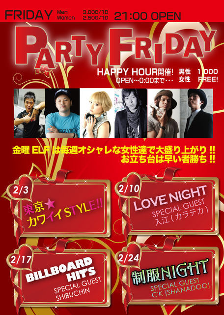 ■2月17日金曜日、21時オープン 超豪華なゲストが出演で金曜日渋谷一の盛り上がりを見せる 「PARTY FRIDAY -BILLBOARD HIT'S-」@渋谷 ELF GUESTにDJ SHIBUCHIN登場! イベント規模:500人 ※先着100名様にDJ BOBBYによるノベルティーMIX CD(2月版)プレゼント!! ☆★☆★☆★☆★☆★☆★☆★☆★☆★☆★☆★☆★☆★☆★☆★ 私までメッセージを送っていただきゲストを取得していただけたら、 [特別ディスカウントゲスト料金] ・21時〜0時までにご入場 → 女性:入場無料 男性:1000円/ノードリンク ・0時以