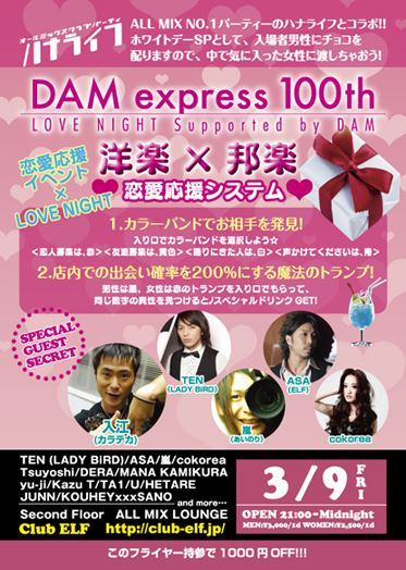3月9日渋谷ELF(エルフ)にて 恋愛応援イベントLOVE NIGHT http://mixi.jp/view_community.pl?id=4262043 毎回1000人越えのラブビートの姉妹イベント週末バージョンです !! 今回は話題のALL MIX NO.1PARTYのハナライフとコラボ さらにはホワイトデーSP 入場の男性にチョコを配ります 気に入った女子にチョコを渡しちゃおう 入り口で4種類のカラーバンドを選択 してもらっての入場 詳しくはこちらでチェック http://ameblo.jp/lo