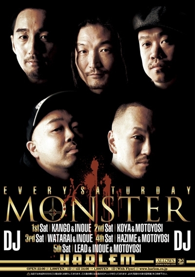 管理人様、書き込み失礼します。 2/16[sat]渋谷HARLEM[MONSTER] ☆★☆★☆★☆★☆★☆★☆★☆★☆★☆★ ■ゲストでの入場方法はエントランスにて、 【シノブのゲストでハーレム】 と伝えて頂ければディスカウント料金でご入場出来るのでご利用下さい! ディスカウント料金は... 22:00〜24:00 \1000/1d 24:00〜Close \2000/1d となります。 ☆★☆★☆★☆★☆★☆★☆★☆★☆★☆★ [MONSTER] @渋谷HARLEM OPEN.22:00〜 HipHop,R&B,etc... DJ KANGO (一週) KOYA (二週) WATARAI (三週) HAZIME (四週)