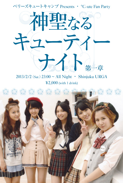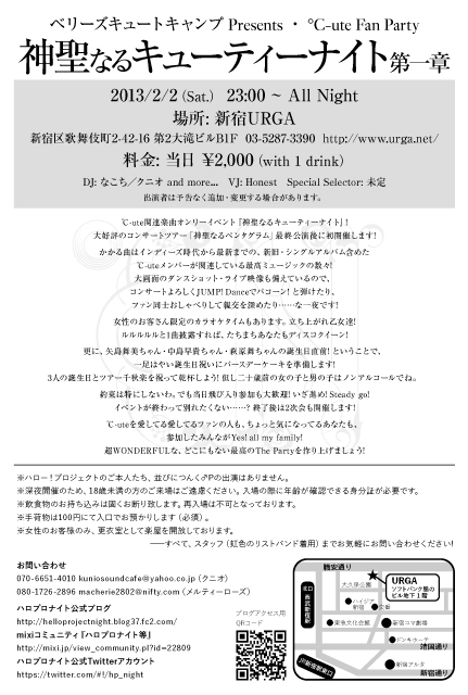 ℃-uteコン福岡公演生配信を見た勢いで代理立てします。 2月2日の渋公ファイナル後に、初の℃-ute関連オンリーイベントを以下の通り開催します! 自分もベリーズキュートキャンパー(?)として参加します。 ---- ベリーズキュートキャンプ プレゼンツ “神聖なるキューティーナイト 第一章” 日時:2013年02月02日(土) 23:00〜All Night!! 会場:新宿URGA 03-5287-3390 住所:新宿区歌舞伎町2-42-16第二大滝ビルB1 http://www.urga.net/ 料金:当日2000円(1ドリンク付) DJ:なこち/クニオ and more... VJ:Honest