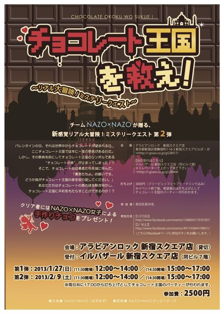 【公認/現在計185名】2/9(土)チョコレート王国を救え! 〜リアル大冒険☆ミステリークエスト〜 魔法の迷宮「アラビアンロック」を貸切! チョコレート王国を救え! 〜リアル大冒険☆ミステリークエスト〜 魔法の迷宮「アラビアンロック」を貸切! -------------------------------------------------------------------------------- 【第1公演】【1/27(日)】(11:30開場) 12:00〜14:00 【第2公演】【1/27(日)】(14:30開場) 15:00〜17:00 【第3公演】【2/ 9(土)】(11:30開場) 12:00〜14:00 【第4公演】【2/ 9(土)】(14:30開場) 15:00