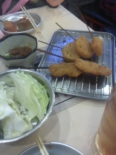 今回は彼女が先の大阪遠征で食べ損ねたという『串カツ』で企画します! 新年会も一巡するであろう2月の第一火曜日で日程設定しました。詳細は後日お知らせしますが皆さんの参加をお待ちしております。 -------------------------- 場所を決めました。 2013年2月5日(火)19:30〜(いつもより少し早めにしています。) 国立駅南口徒歩2分 串カツ酒場 木村 住所 〒186-0004 東京都国立市中1-10-13 国立ビル1F TEL 042-505-9421 http://r.gnavi.co.jp/gb0j302/map/ 今の所参加者は、 いつもの三人姉妹(笑)とお父さん三人(くろ