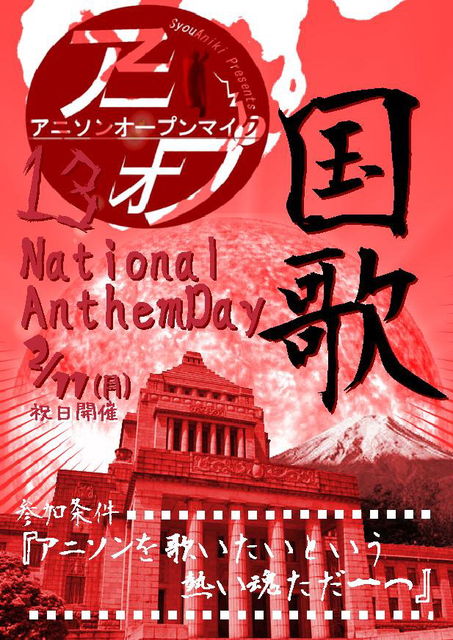 〜小アニキ・プレゼンツ〜 『第十三回アニソン・オープンマイク national anthem Day』咆哮開催! 2月11日(”月”祝日) OPEN 19:00 START 20:00 ☆参加条件☆ ※それは『アニソンを歌いたい!』という熱い魂!! 【重要】 ※新年一発目は開催日が建国記念日ということでテーマは”国”です。 2曲中1曲は何か”国”関連のアニソンを宜しくお願い致します。 ☆募集要員☆ ※9組 (前回王者キャンセルの場合”1枠”追加します。) ☆場所☆ Cafe Dolce Vita (HP)http://www1.to/dolce-vita ☆参加者☆ チャ