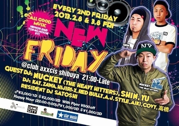 ´ÉÍý¿ÍÍÍ¡¢¹ðÃμºÎ餷¤Þ¤¹¡£ÉÔŬÀÚ¤ÊÆâÍÆ¤Ç¤·¤¿¤éºï½ü¤ª´ê¤¤Ãפ·¤Þ¤¹¡£ NEW FRIDAY!! 2013ǯ2·î¤è¤ê¡¢axxcis SHIBUYA¤Î¶âÍËÌ뤬¥¬¥é¥Ã¤ÈÊѤï¤ê¤Þ¤¹!! Á´¹ñ¤Ç³èÌöÃæ¤ÎÂçʪ¿Íµ¤DJ¤¬Ëè½µ¥²¥¹¥È½Ð±é¤·¡¢HIP HOP¤ò¥á¥¤¥ó¤ËALL MIX¤ÇÀ¹¤ê¾å¤²¤Þ¤¹¡£ ¤µ¤é¤Ë¡¢Âç¿Íµ¤¥¢¥Ñ¥ì¥ë¥Ö¥é¥ó¥É¤äÈþÍÆ¼¼¤â»²²Ã¤·³§Íͤ¬³Ú¤·¤á¤ë´ë²è¤ò¤´ÍѰա£ 24»þ¤Þ¤Ç¤Î"HAPPY HOUR"³«ºÅÃæ!! ¡é \1000/noD , ¡ê \1000/2D¤Ç¤Î¤´Æþ¾ì¤¬²Äǽ¤Ç¤¹!! ÃíÌܤÎÂè2½µ(2/8)¤Ï¡¢ Àµ¿¿ÀµÌäÎNYC¥¹¥¿¥¤¥ë¤òÂ轤¹¤ë"THE HEAVY HITTERS"¤«¤éDJ NUCKEY¡¢ ¸½ºß½Âë¤äÏ»ËÜÌÚ¤òÃæ¿´¤Ë¿ô¡¹