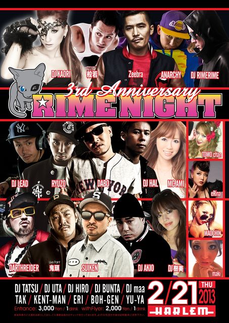 ゲスト受付ております!!お気軽にメッセージ下さい!! またはHARLEMエントランスにて DJ TATSUのゲストでハーレムと言えばゲスト料金にてご入場出来ます!! 東京渋谷から発信され大きな話題を呼ぶBIG PARTY "RIME NIGHT"が遂に3周年を迎えます! 今回HARLEMで行なわれる記念すべき日の超豪華出演陣にはDJ RIMERIMEを筆頭に日本のHIP HOPシーンを代表する蒼々たるメンツが勢揃い!! GUEST LIVEには般若/ANARCHYがスタンバイ、ステージ上で鮮やかに展開される鬼頭のLIVE PAINTING、DJにはあのQUEEN DJ KAORI、from HEAV