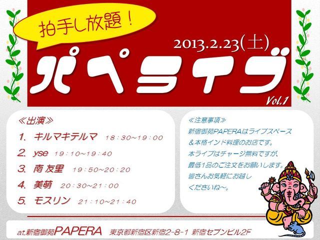 さぁ キルマキテルマ 2013年初ライブです そして会場は本格的なインド料理屋さん しかもチャージ無料 (但し、最低1品はオーダー願います。) 会場の下見に行ったメンバーによれば、かなり美味しいとのこと まだまだ寒い日が続きますが、ホットな料理と演奏で暖まる …なんていうのはいかがでしょうか? 皆さんのお越しを心よりお待ちしています ◆◇◆◇◆◇◆◇◆◇◆◇◆◇◆◇◆◇◆◇◆◇◆◇ 「拍手し放題!パペライブ」 日時:2月23日(土) 開店:17:00