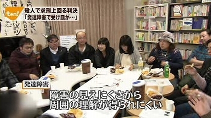 開催日時 2013年2月6日 19:30〜21:30 開催場所 Alternative Space Necco 東京都新宿区西早稲田2-18-21 ハシバビル202 今回の水曜勉強会では、1月24日に関西地区で放映された、 Necco取材シーンを含む番組「かんさい情報ネット ten!」と 「NHKハートネットTV」の上映会を行います。 19:30〜19:45 読売テレビ「かんさい情報ネット ten!」 2013年1月24日放送 『殺人で求刑超える判決「発達障害で社会に受け皿が…」』特集上映 http://www.ytv.co.jp/ten/ 20:00〜20:30 NHKハートネットTV 2012年10月10日放送 福マガ プラス「大阪地裁判決